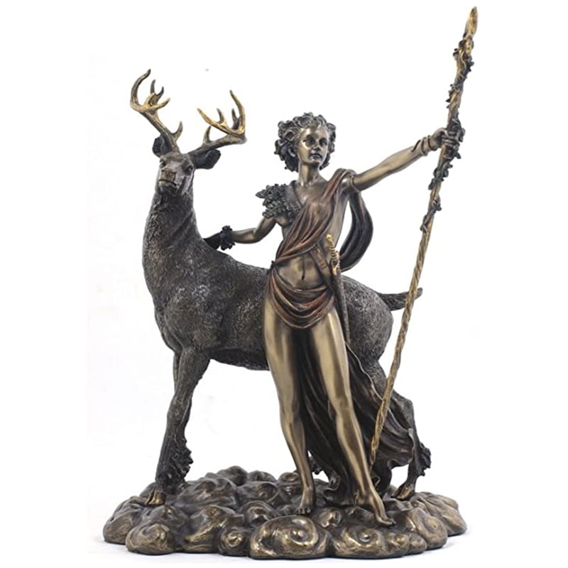 Diana is the Roman goddess of the countryside, hunters, crossroads, and the Moon. She is equated with the Greek goddess Artemis, and took on much of Artemis’ mythology early in Roman history, including a birth on the island of Delos to parents Jupiter and Latona, and a twin brother, Apollo, though she had an independent origin in Italy.