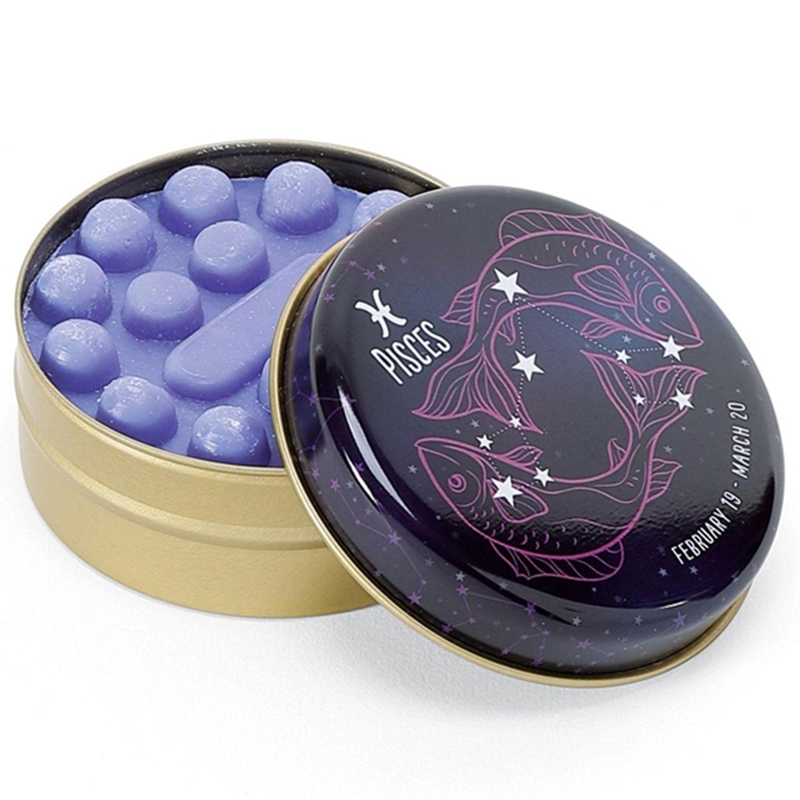 Olive Oil massage soap in a food safe tin with the Pisces astrological sign decorative art.
